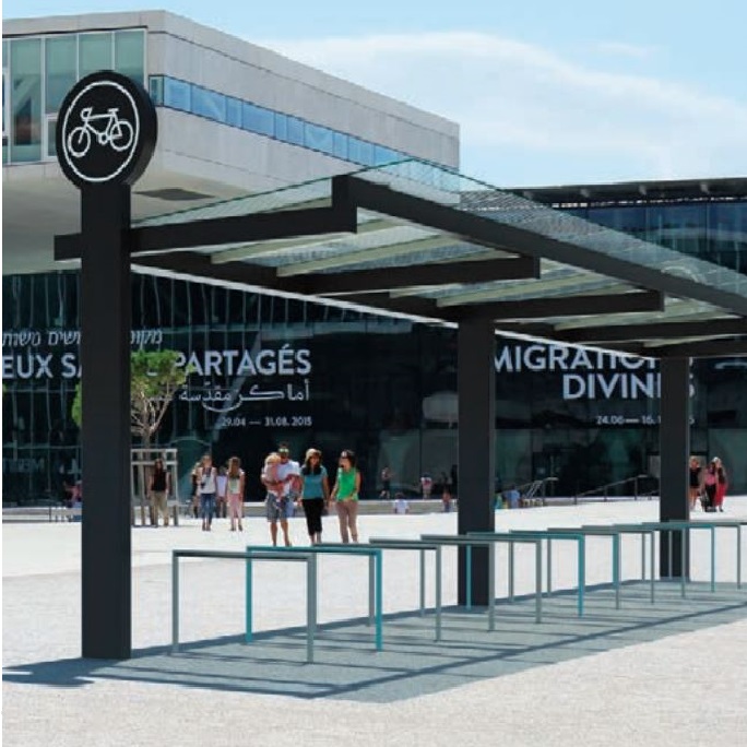 Amezeus offers a selection of bike shelters, specially designed to be installed in public and urban spaces. Our bike shelters are designed with high quality materials that provide optimal resistance in the urban environment. Thanks to high quality shelters, increase the use of bicycles in your town or city. The steel structure and modern design enables a perfect integration of the furniture into the urban environment.